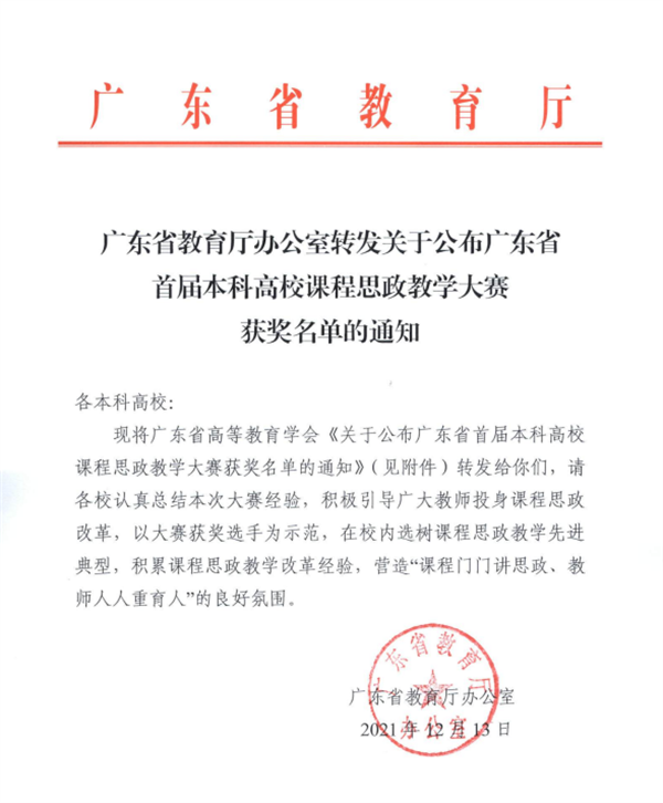 据悉,广东省首届本科高校课程思政教学大赛设文科一组、文科二组、理科组、工科组、农医组、外语组共六个组,全省各本科高校共推荐450名教师参赛,107名参赛教师入围决赛,共评选出一等奖18名、二等奖30名、三等奖42名、优秀奖16名。伟德bv国际体育将以此为契机,落实立德树人根本任务,深化课程思政教学改革,引导广大教师充分发挥课程育人功能,提高人才培养质量。