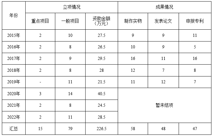 2015年共青团广东省委员会、广东省财政厅决定设立“攀登计划”专项资金,至今已开展八年。伟德bv国际体育每年的立项项目及资助金额均稳居同类院校首位。2015-2019年立项的54个项目均顺利结项,制作实物58个、发表论文48篇、申报专利47项。