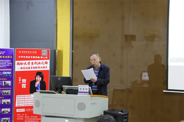 讲座最后,张珂作总结。他对樊霞的精彩分享致以衷心感谢,并表示此次讲座为同学们打开了一扇通往创新创业世界的新大门,提供了宝贵的经验和深刻的启示。他鼓励同学们要将讲座中学到的知识和理念积极运用到实际的创业实践中,勇于尝试,敢于创新,不断提升自己的创业能力。