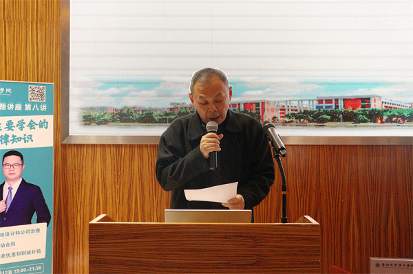 讲座伊始,教务处处长张星明致辞。他指出,创业征程由法律护航,企业的设立、运营、发展各个环节,无一不与法律紧密相连。如果缺乏法律知识,创业就如同在迷雾中摸索前行,极易陷入困境。学校希望同学们通过本次讲座,将法律知识化为创业利刃,提升法律意识与素养,依法依规创业,防范风险,为梦想筑牢根基。