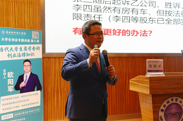 互动答疑环节,现场学生踊跃提问,涵盖知识产权保护、商业秘密保护等法律问题。欧阳军凭借丰富知识和经验耐心解答,现场气氛热烈。